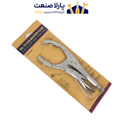 انبرقفلی فیلتر باز کن پانتند کد PNTD0077 : انبری است که بسیار پر کاربرد می باشد به طور کلی انبر قفلی ها ابزاری پرکاربرد می باشند که هم برای باز کردن و سفت کردن یک پیچ و هم برای ثابت نگه داشتن قطعاتی که دارای آچار گیر نمی باشند، استفاده می شود.این محصول با کیفیت تولید شده شرکت پاتنت PATENTED می باشد که یکی از شرکت های بزرگ و شناخته شده در زمینه ابزار آلات می باشد. این شرکت در تولید ابزار ها از متریال های با کیفیت و مرغوب استفاده می نماید. در ساخت این ابزار دقت زیادی شده است تا طول عمر بالا و کارایی آن افزایش یابد.روکش این محصول از جنس آبکاری آلیاژی می باشد به منظور کاربری آسان کاربر و خاصیت ضدپوسیدگی آن بسیار مهم می باشد. علاوه بر این ساخت دندانه های نوک فک با ظرافت و دقت ساخته شده است. لازم به ذکر است که بدنه طوری پوشش دهی شده است تا از زنگ زدگی و خوردگی به مرور زمان جلوگیری شود.جنس بدنه و جنس فک از متریال های با کیفیت ساخته شده است جنس بدنه از کروم-مولیبدن و جنس فک از کروم-انادیوم می باشد که بسیار با کیفیت و مقاوم می باشند. این محصول آبکارش شده از نیکل می باشد و وزنی معادل420 گرم دارد.
